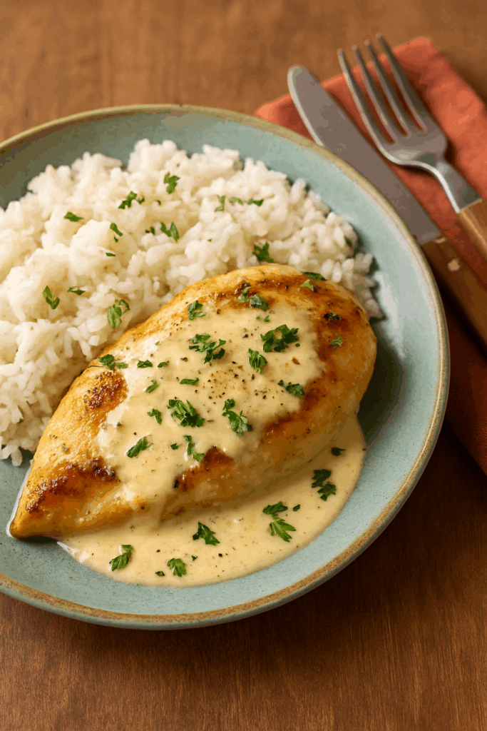 - Pinterest-worthy presentation – golden chicken in silky white sauce.